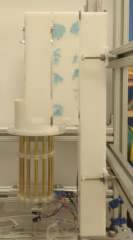 Cap placement was iterated to be more reliable after repeated uses. Metal tongs were fashioned to both hold the cap in place and to push it flush onto the bottle as it moves. This passive system was a large success.